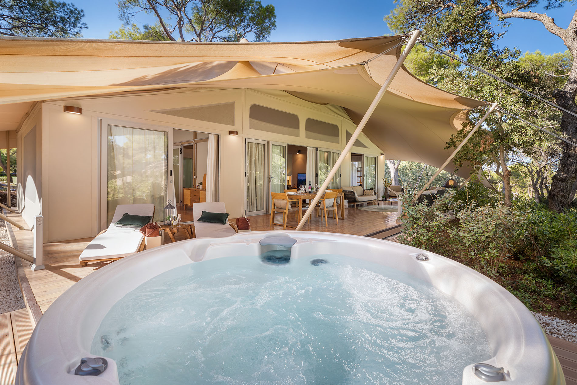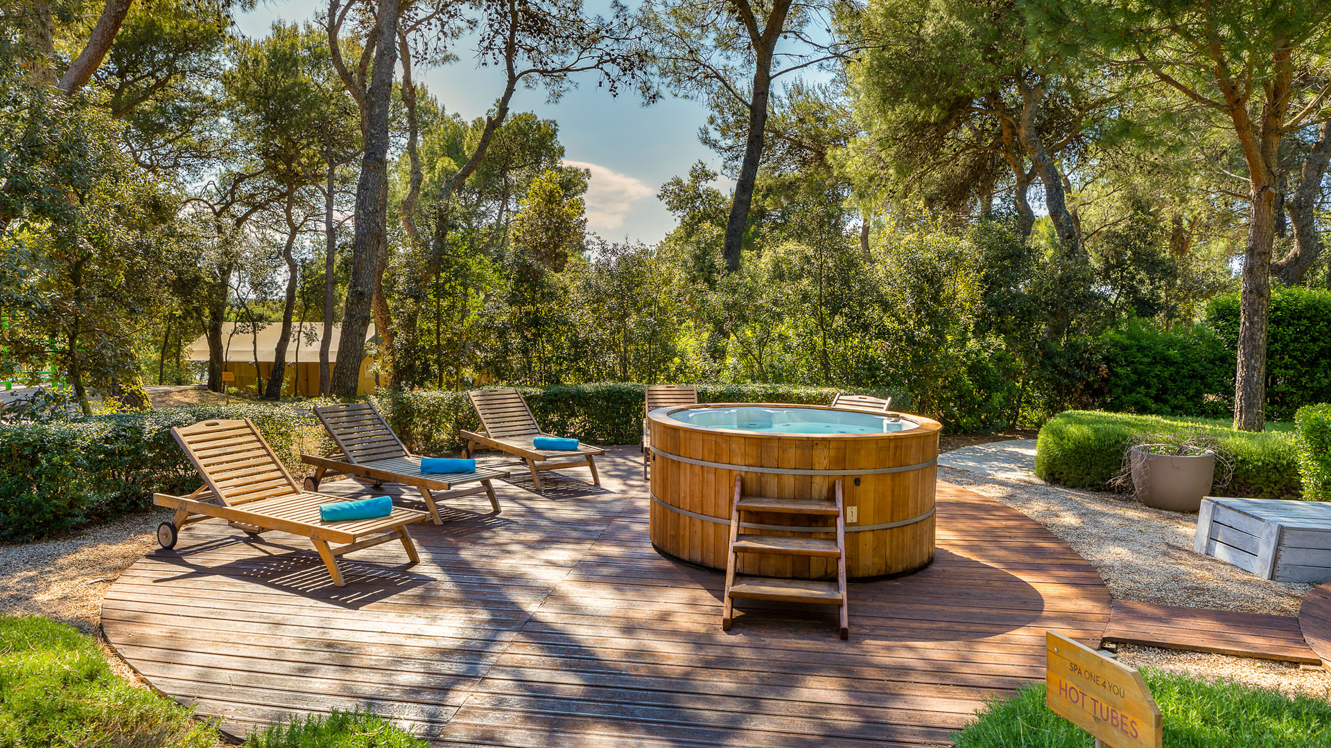 Erleben Sie Glamping, wie es sein soll — in einem hot tub unter freiem Himmel, umgeben von der Ruhe eines üppigen Waldes und dem Komfort Ihrer eigenen privaten Oase.